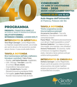 VOGLIAMO CREAREOPPORTUNITA' DI LAVOROECONOMICAMENTESOSTENIBILI E APPREZZATE PER LA LORO QUALITA'...CONTINUA PERCHE' LE PERSONE,ANCHE IN SITUAZIONI DISAGIATE,SIANO ACCOMPAGNATENELLA SCOPERTADELLA LORO DIGNITA'CONTINUA CREARE PROGETTUALITA'CON ENTI PUBBLICI,IMPRESE PRIVATE EOPERE SOCIALI...CONTINUA PER CONTRIBUIRECON EFFICACIA E QUALITA'ALLA COSTRUZIONEDEL BENE COMUNE.CONTINUA PERCHè ANCHEL'ASPETTO SOCIALEè UN MOTIVO IN Più PER PUNTARECON DECISIONE SULLA QUALITà...CONTINUA PERCHè ANCHEL'ASPETTO SOCIALEè UN MOTIVO IN Più PER PUNTARECON DECISIONE SULLA QUALITà...CONTINUA PERCHè ANCHEL'ASPETTO SOCIALEè UN MOTIVO IN Più PER PUNTARECON DECISIONE SULLA QUALITà...CONTINUA PERCHè ANCHEL'ASPETTO SOCIALEè UN MOTIVO IN Più PER PUNTARECON DECISIONE SULLA QUALITà...CONTINUA PRIMO PIANONel 2026la Cooperativa Giottocompie 40 anni!LEGGI... MISSION E VISIONScopri le ragionidel nostro lavoroLEGGI... CONTACT CENTERATTIVITÀ INBOUND E OUTBOUND,SERVIZI DI BACK OFFICEAD ALTO CONTENUTO TECNICOE CON ELEVATI LIVELLI DI SICUREZZA GESTIONE VERDEUn'attentacura del verdeper un correttoequilibriotra uomo e natura AMBIENTERaccolta e trasportorifiuti urbanie industriali,anche in modalitàporta a porta.Spazzamenti manualie meccanizzati SCOPRI GLI ALTRI SERVIZI GALLERIA