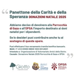 Quest’anno la festa di Natale l’abbiamo fatta all’Opera della Provvidenza S. Antonio e la cooperativa ha donato l’equivalente della spesa dei doni natalizi alla parrocchia di Gaza e all’Opsa di Rubano. Da questo spirito è nato il Panettone della Carità e della Speranza, e ognuno può contribuire a questo progetto.